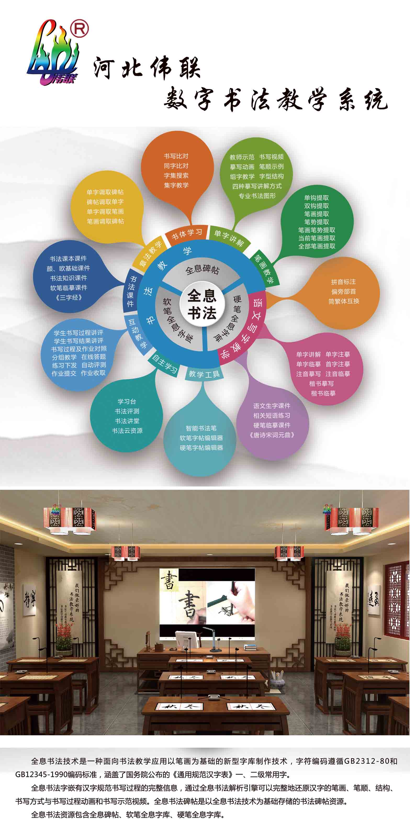 河北偉聯(lián)教學儀器設(shè)備有限公司開拓的數(shù)字化書法教室,涵蓋了全息書法下的“全息碑貼”、“硬筆全息字庫”、“軟筆全息字庫”,以“書法教學”和“語文寫字教學”為基礎(chǔ),字符編碼遵循GB2312-80和GB12345-1990編碼標準,通過全息書法解析引擎可以完整地還原漢字的筆畫、筆順、結(jié)構(gòu)、書寫方式與書寫過程動畫和書寫示范視頻。